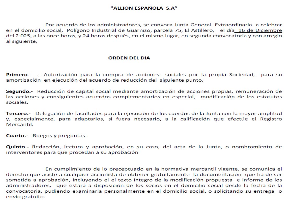 Por acuerdo de los administradores, se convoca Junta General Extraordinaria a celebrar en el domicilio social, Polígono Industrial de Guarnizo, parcela 75, El Astillero, el día 16 de Diciembre del 2.025, a las once horas, y 24 horas después, en el mismo lugar, en segunda convocatoria
